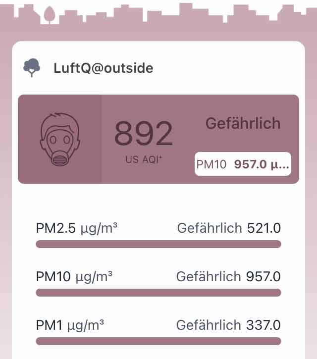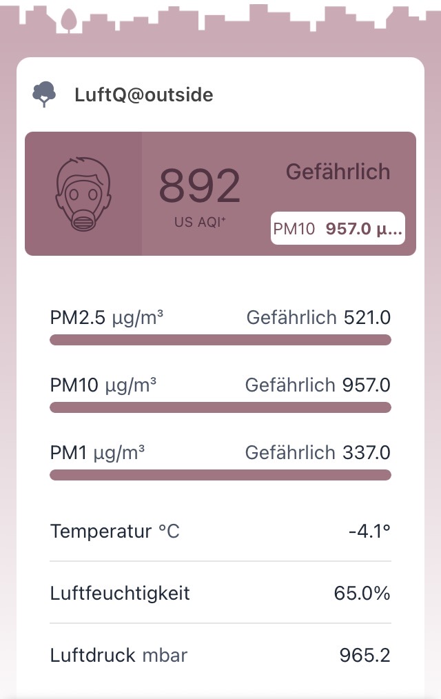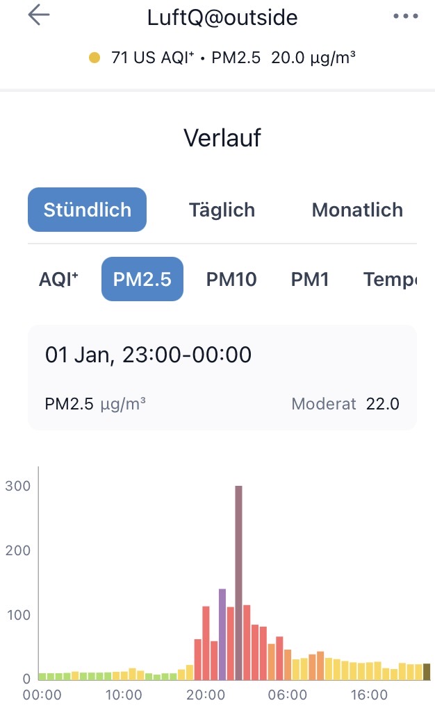 So verdoppelten sich bei unserer IQAir-Messstation Im Isengrind 8046 Zürich im Vergleich zum Vorjahr der höchste gemessene PM2.5 Stunden-Mittelwert von ca. 150 µg/m3 (01.01.2025) auf ca. 300 µg/m3 (01.01.2026), und der PM2.5 Kurzzeitmesswert betrug 2026 gar “gefährliche” 521 µg/m3: