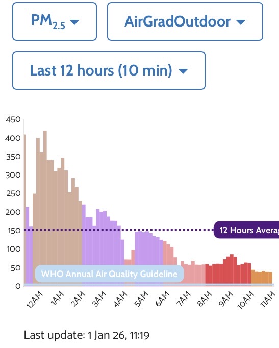 Die Air-Gradiant-Messstation Zürich-Affoltern zeigte am 1. Januar 2026 einen PM2.5 10-Minuten-Mittelwert von über 400 µg/m3 und ein PM2.5 12-Stunden-Mittelwert von 150 µg/m3: